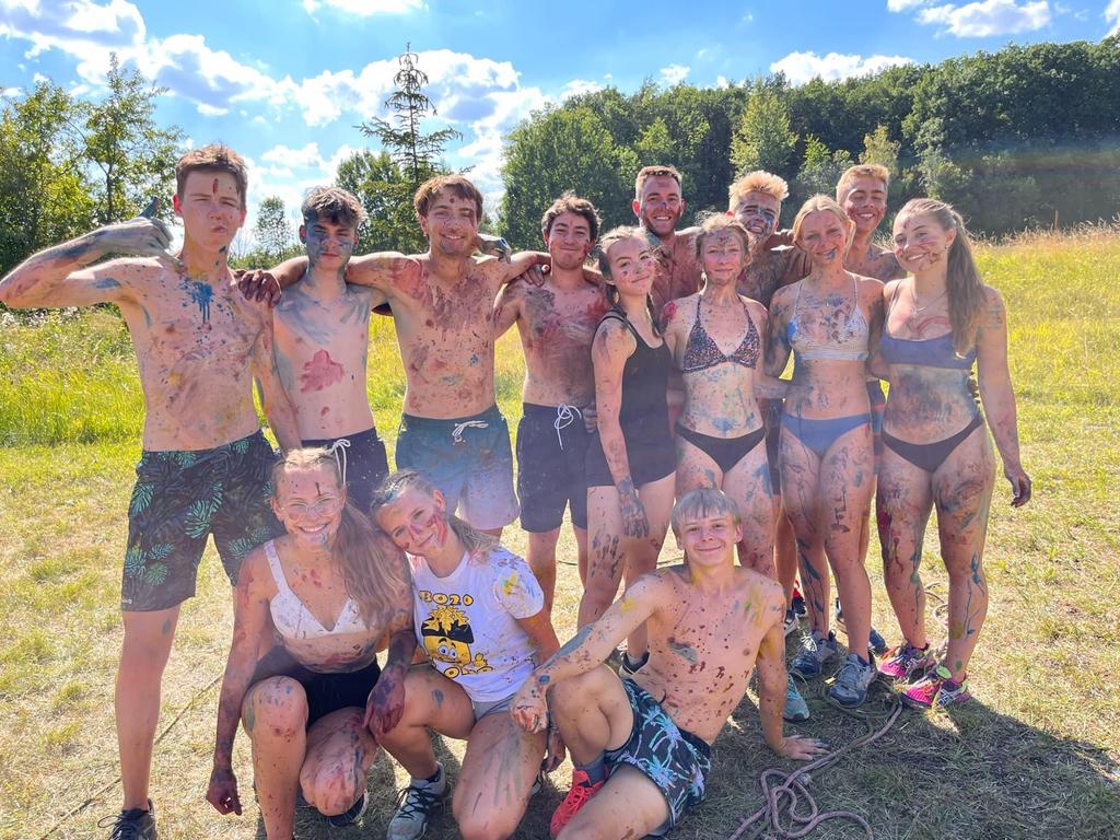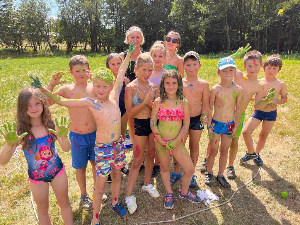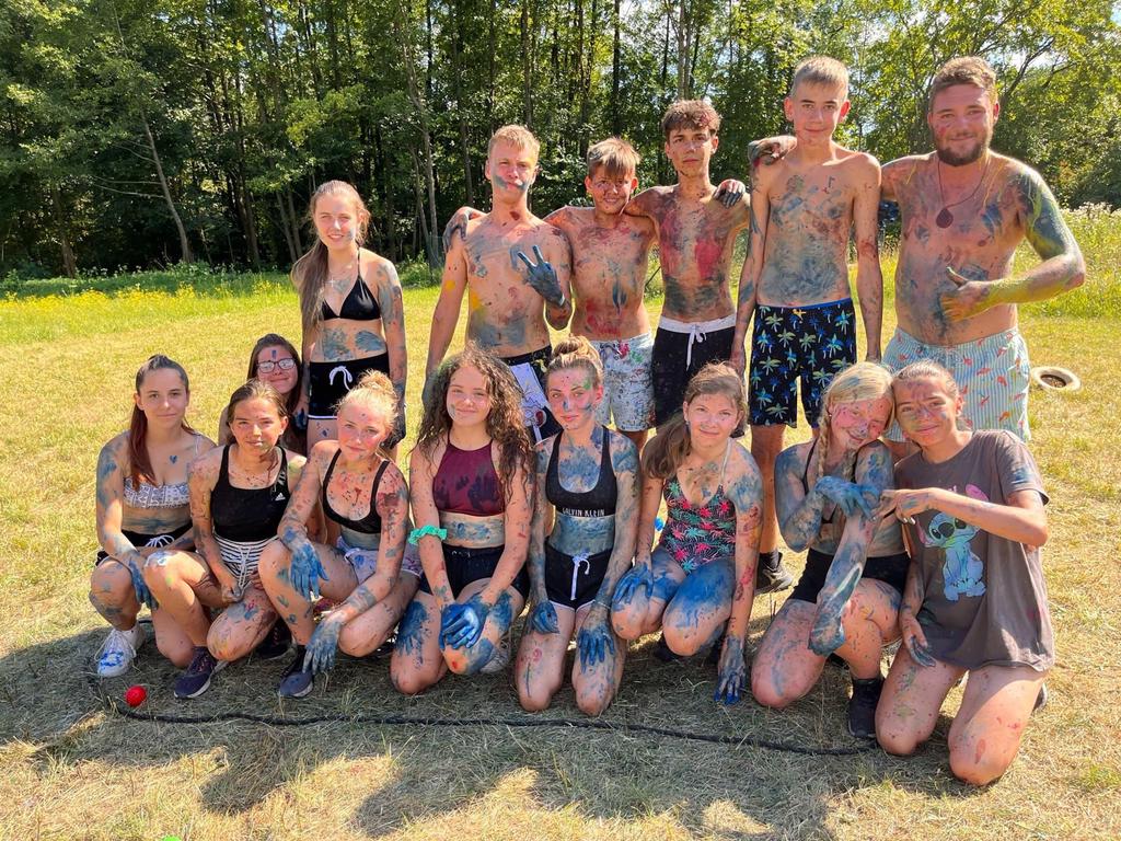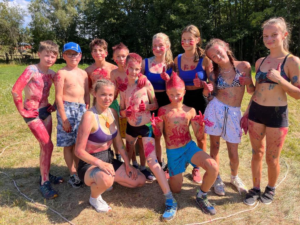 Oddíly se nám při hře s míčky namočenými v barvě nádherně zaprasily. Tedy nejdříve se některá děvčata nechtěla umazat, ale po pár cákancích barvou vše nabralo na obrátkách a děti začaly barevné balónky pálit i do vlastních řad, jen proto, aby byly všechny pořádně špinavé. A když už se nám děcka tak krásně zmalovala, udělali jsme hromadné fotky všech soutěžních oddílů.