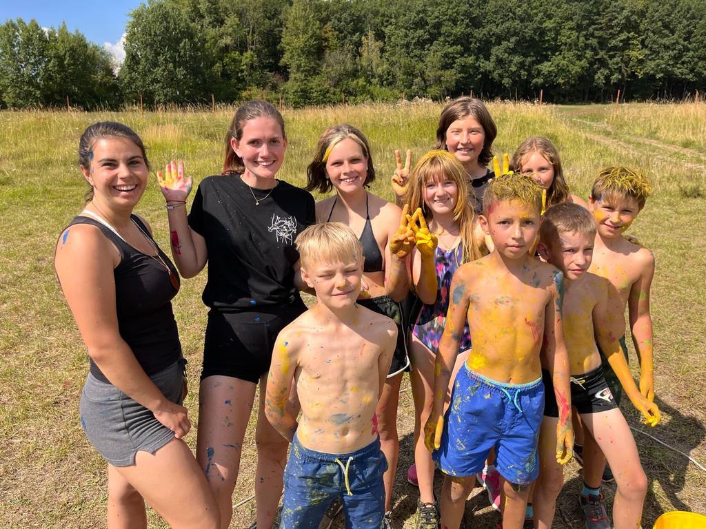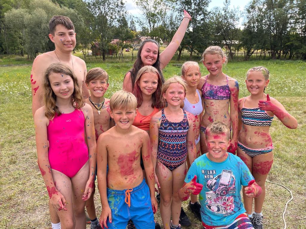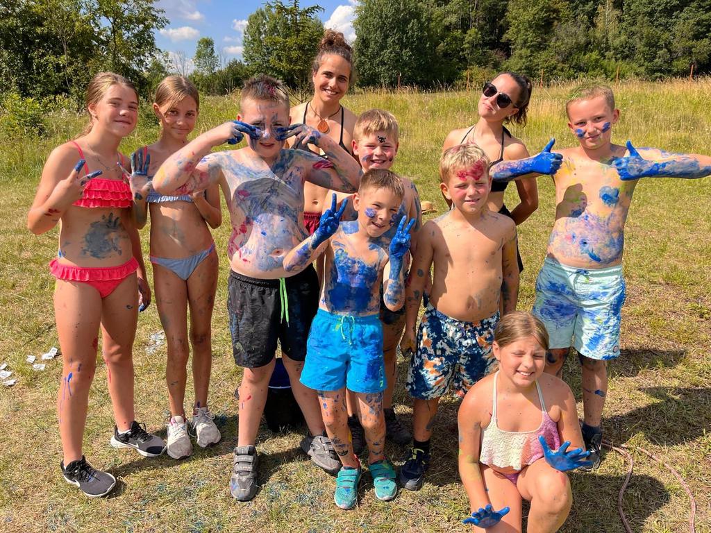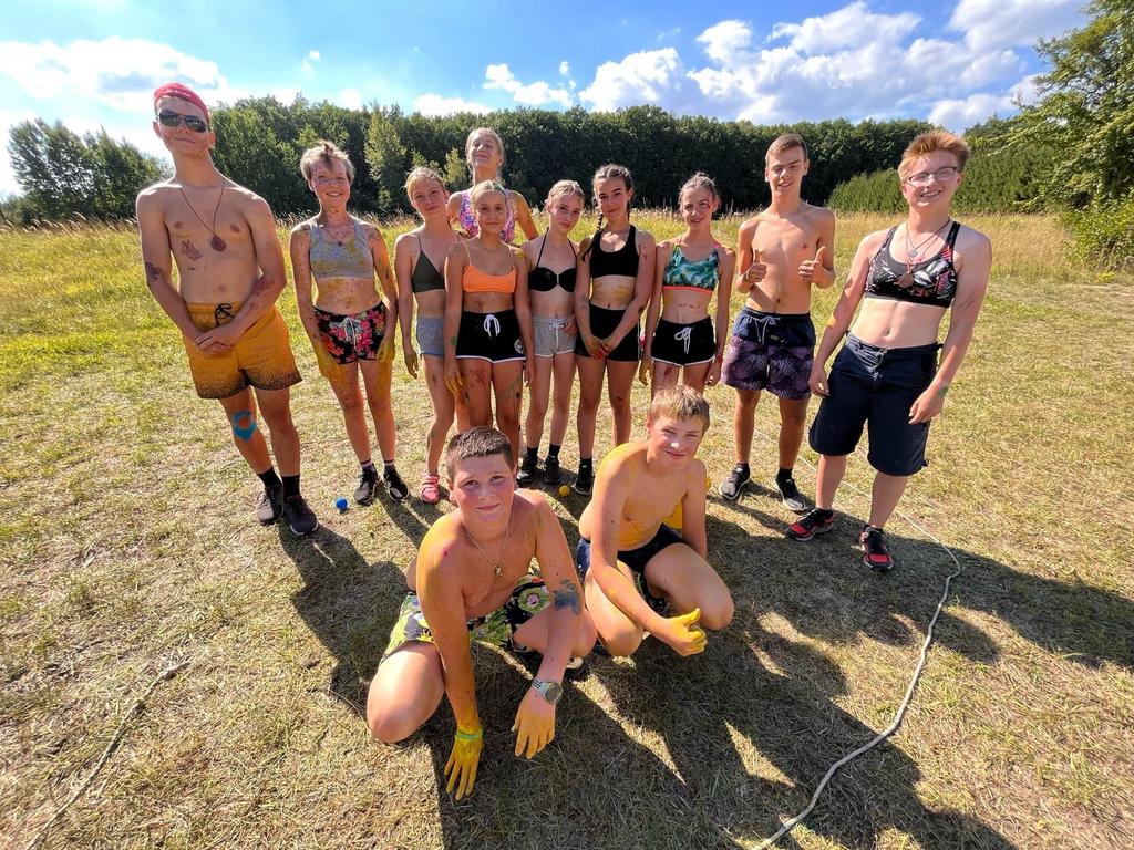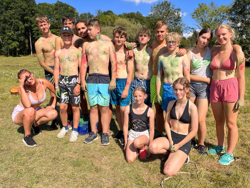 Oddíly se nám při hře s míčky namočenými v barvě nádherně zaprasily. Tedy nejdříve se některá děvčata nechtěla umazat, ale po pár cákancích barvou vše nabralo na obrátkách a děti začaly barevné balónky pálit i do vlastních řad, jen proto, aby byly všechny pořádně špinavé. A když už se nám děcka tak krásně zmalovala, udělali jsme hromadné fotky všech soutěžních oddílů.