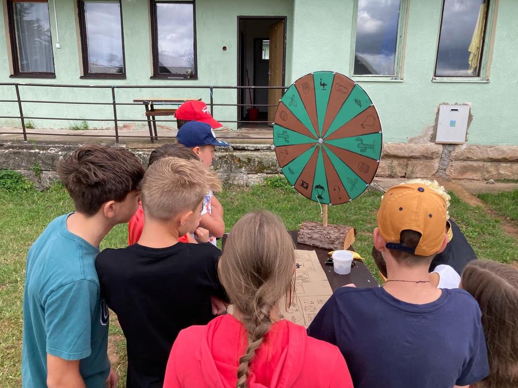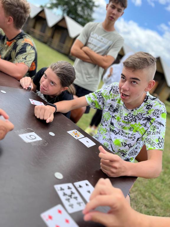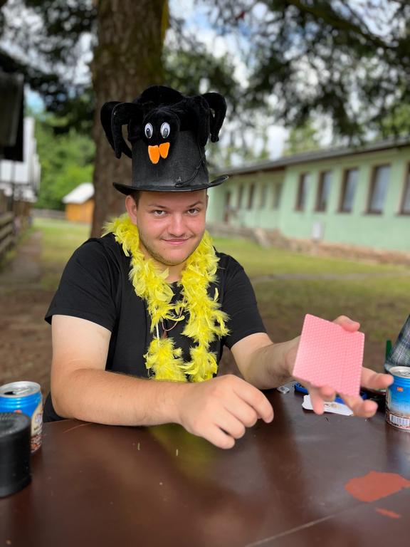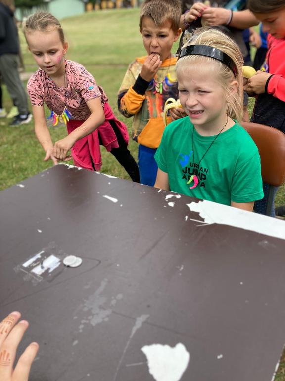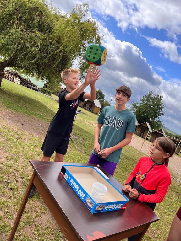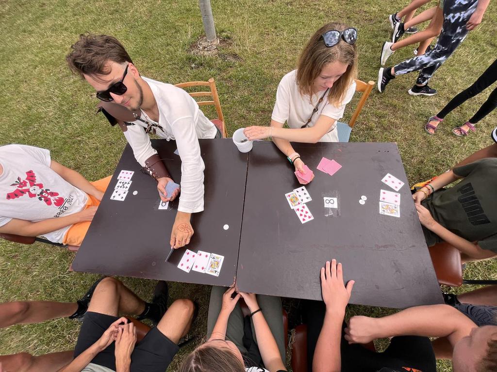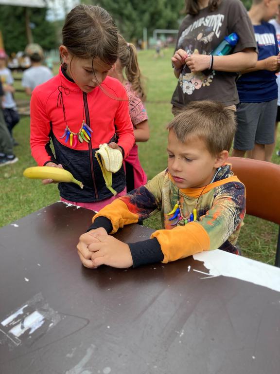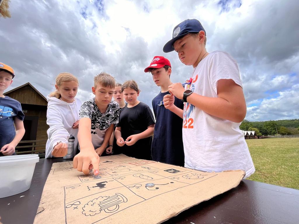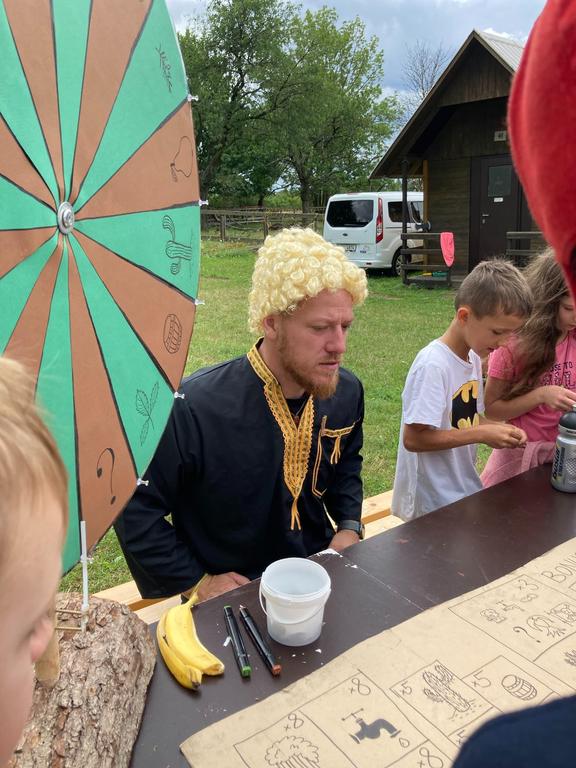 Ve čtvrtek už jsme se mohli těšit z přítomnosti sluníčka. Ráno jsme zahájili trochu gamblerských způsobem a z našeho tábořiště se stalo velké Casino, kde děti mohly vyzkoušet spoustu zábavných hazardních her jako ruletu, poker, tahání sirek a házení kostkami. Tomuto dopoledne nechyběl i zásah banditů, kteří vyloupili banku, ale nebojte, lupiči byli dopadeni a potrestání řádným způsobem.